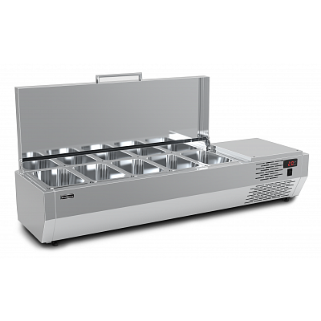 Витрина для ингредиентов Carboma A30 SM 1,2 (5 GN1/4) с крышкой предназначена для охлаждения, кратковременного хранения и визуальной демонстрации ингредиентов и готовых блюд, используемых при приготовлении салатов, пиццы и других блюд. Устройство может устанавливаться на столы для пиццы, холодильные столы, барные стойки и прилавки.