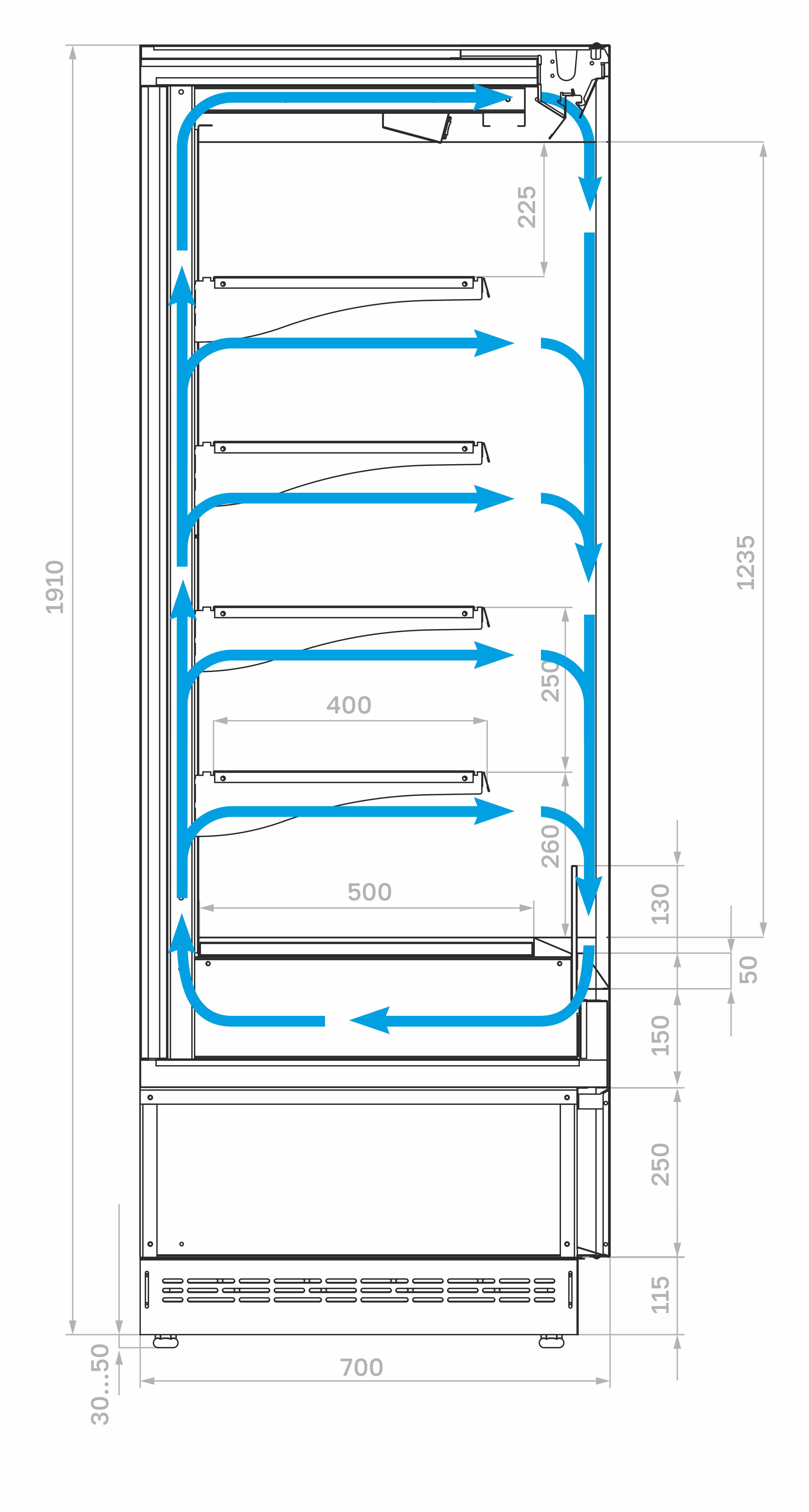 Модель оснащена 4 рядами навесных полок с кронштейнами, подставкой с фронтальной термовыводящей и цокольной решетками. Корпус прямоугольной формы изготовлен из стали с антикоррозийным покрытием: внешние панели, полки и кронштейны —