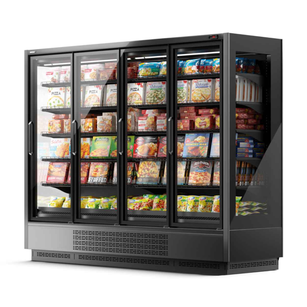 Модель оснащена пятью рядами полок с ценникодержателями и вертикальной LED-подсветкой, обеспечивающей равномерное освещение каждого уровня выкладки. Двери из стекла с теплотражающим покрытием минимизируют потери холода и предотвращают образование конденсата.
