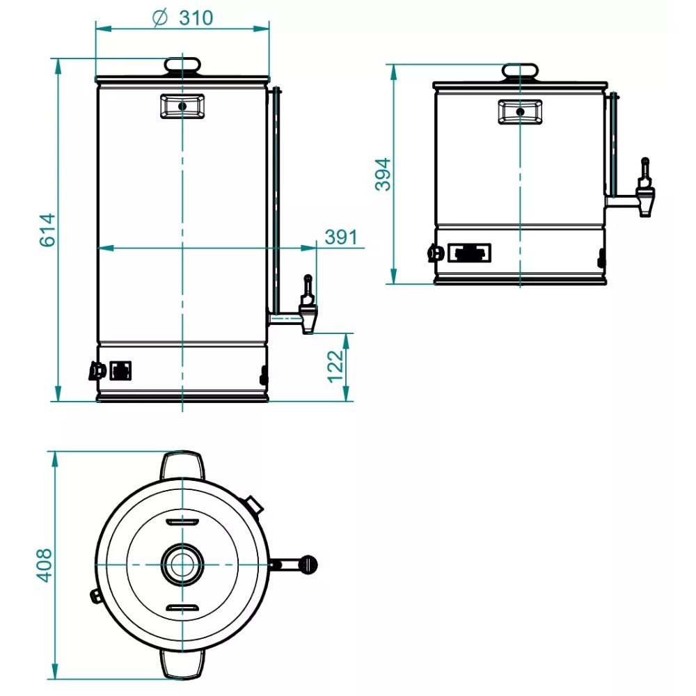 Модель оборудована световым индикатором, сигнализирующим о работе нагревательного элемента, что позволяет легко контролировать процесс. Встроенный датчик уровня воды обеспечивает безопасность эксплуатации, предотвращая перегрев при недостаточном количестве жидкости. Для визуального контроля объема предусмотрена колба, позволяющая быстро оценить уровень наполнения резервуара. Время нагрева воды до температуры кипения не превышает 60 минут, что обеспечивает оперативную подготовку к работе. Сливной кран упрощает раздачу горячей воды и делает использование устройства более удобным.