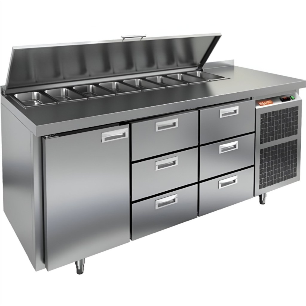 Каталог оборудования Холодильное оборудованиеСтолы охлаждаемыеСтолы холодильные для салатовСтол холодильный для салатов HiCold SL1-133GN (1/3) с крышкой Стол холодильный для салатов HiCold SL1-133GN (1/3) с крышкой Код товара: 064-848 Поделиться: WhatsAppTelegram СравнитьДобавить в КПВ избранное 0 209 962 ₽ В корзину 0 шт Под заказСамовывоз сегодня бесплатно Взять в кредит Купить в лизинг Получить консультацию в WhatsApp Описание Характеристики Отзывы 0 Стол холодильный для салатов HiCold SL1-133GN (1/3) предназначен для использования на предприятиях общественного питания и торговли. Он объединяет рабочую поверхность и охлаждаемый отсек, что делает его удобным решением для хранения, охлаждения и подготовки ингредиентов при приготовлении салатов, пиццы и других блюд. Такая конструкция позволяет повару работать быстрее и эффективнее, так как все необходимые продукты находятся под рукой. Корпус и столешница выполнены из прочной нержавеющей стали, устойчивой к коррозии и легко поддающейся санитарной обработке. Металлическая крышка защищает продукты от загрязнений и сохраняет их свежесть. Особенности модели: Электронная панель управления — точная настройка температурного режима. 1 глухая дверь — удобный доступ к холодильному отсеку. 6 выдвижных ящика — быстрое размещение и замена продуктов. Вместимость салат-бара — до 8 гастроемкостей глубиной до 100 мм. Автоматические доводчики дверей с фиксацией в открытом положении. Легкозаменяемые магнитные уплотнители — надежная герметичность. Открытая агрегатная часть — быстрый доступ для обслуживания. Регулируемые по высоте ножки — устойчивость даже на неровном полу. Толщина столешницы, борта и теплоизоляции — 50 мм, что обеспечивает прочность и энергоэффективность конструкции. HiCold SL1-133GN (1/3) — практичное и удобное решение для профессиональной кухни, обеспечивающее удобную подготовку и хранение ингредиентов. Изображение товара, представленного на фото, может отличаться от его фактического вида. Показать все Габаритные размеры1835×700×850 ммДиапазон рабочей температурыот +2 до +10 °CРасположение агрегатаБоковое Материал столешницыНержавеющая Тип столаС дверьми и ящиками Тип двериГлухая Объём505 лКоличество дверей1 штТип гастроемкостейGN 1/3 Количество ящиков6 штРазмер полки530×325 ммНапряжение220 ВМощность0,46 кВтТип охлажденияДинамическое Тип оттайкиАвтоматическая СтолешницаС бортом Габариты в упаковке2000×850×1000 ммВес нетто130 кгВес брутто185 кгБрендHicold Оставить отзыв Еще никто не оставил отзыв на этот товар Ранее просмотрено Под заказ 140 482 ₽ Стол холодильный для салатов HiCold SL2-11GN (1/6) О без крышки