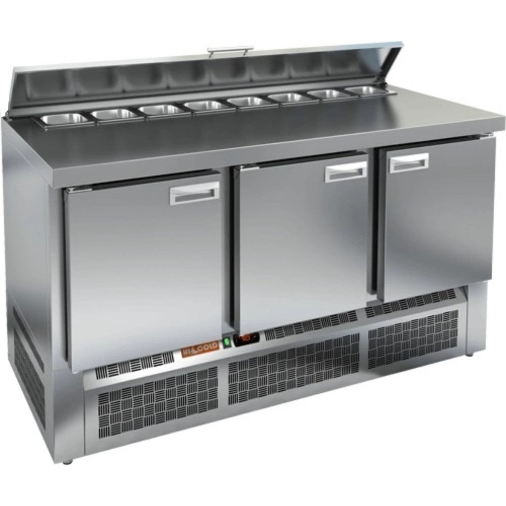 Стол холодильный для салатов HiCold SLE2-111SN (1/6) О З с крышкой предназначен для предприятий общественного питания и торговли. Он используется для хранения, охлаждения и обработки ингредиентов, применяемых при приготовлении салатов, пиццы, закусок и других блюд.