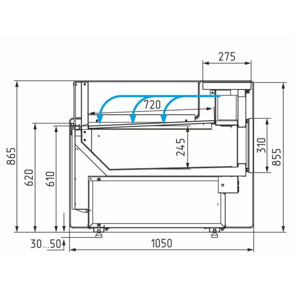 Экспозиционная поверхность и столешница выполнены из шлифованной нержавеющей стали, а декоративная фронтальная панель — из МДФ.