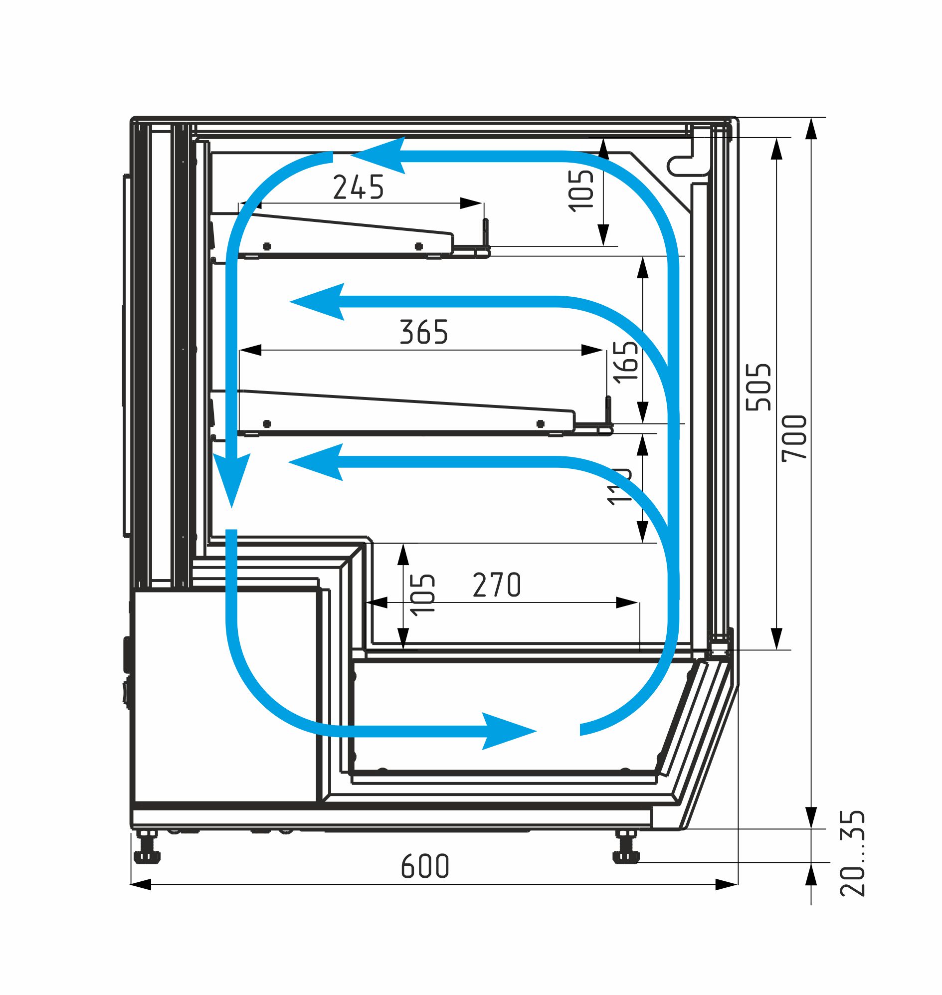 • Максимальная высота выкладки продуктов: нижний поддон — 150 мм, полки — 100 мм